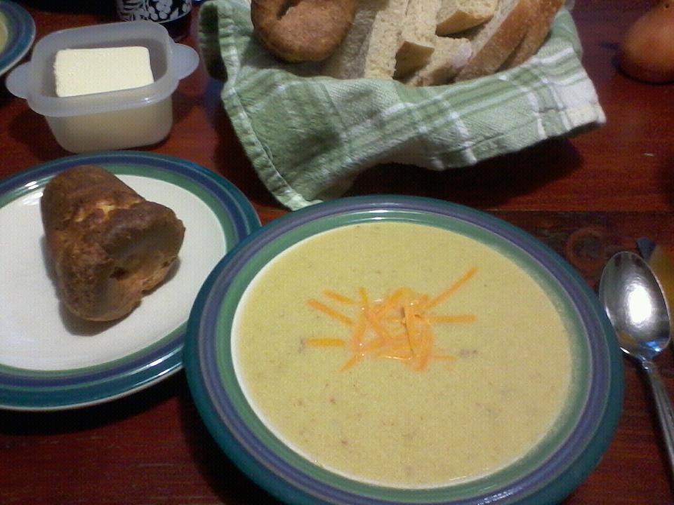Add four cups of cold milk all at once, then reduce heat and simmer until milk has thickened, stirring continuously. (fail to stir at this point, and your roux may burn on the bottom, or ‘break’ which will make it look curdled. Even if you do break it, it’s still quite edible. Most of my own recipes are fairly goof-proof, and this one is an original, arrived at by trial and error. For those REALLY worried about fat, you can skip the butter and just whisk flour into the cold milk and thicken by heating. Once you have something the consistency of good gravy, chowder, or say, wallpaper paste, add your leeks back in, then your chicken broth, and whatever mashed potatoes you have on hand. (More potatoes, add a little more broth, less potatoes, use a little less) I also generally chop five or six strips of very crisp bacon in, add a half cup of fat free sour cream and however much light old shredded cheddar I feel like adding (1/2 cup to a cup, depending on the day, and what’s in the house).